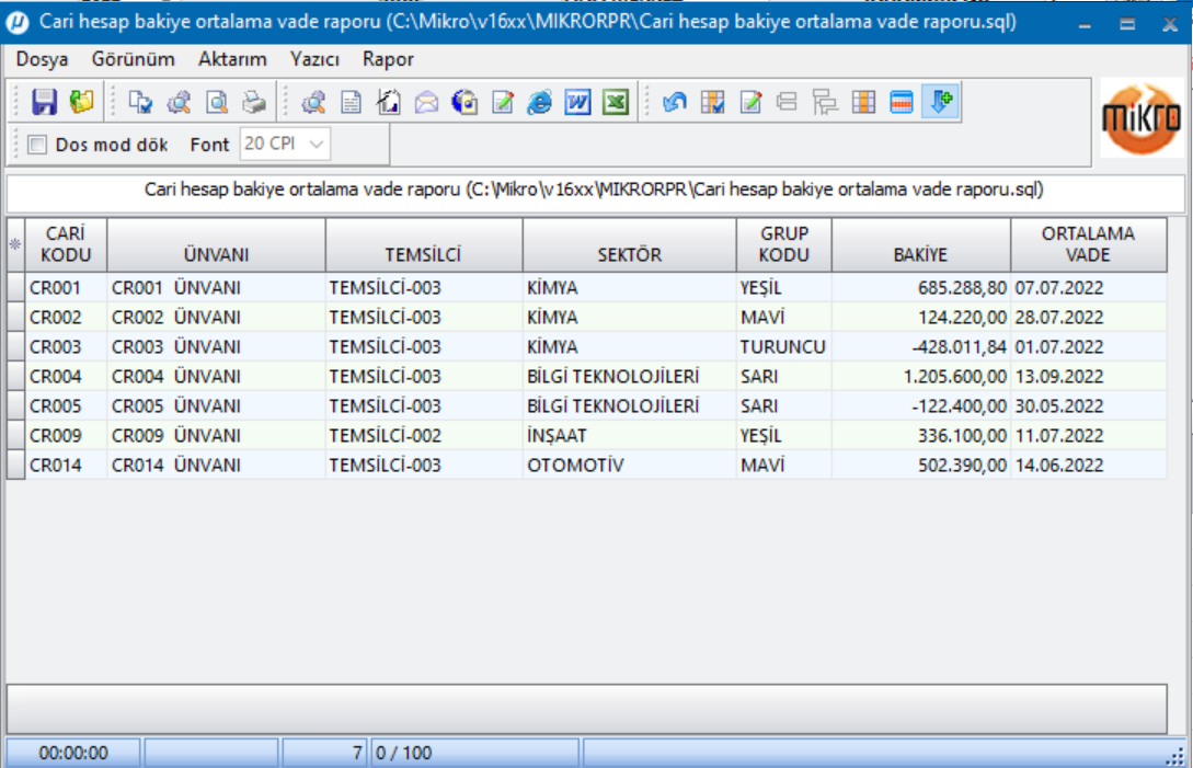 Mikro v16 programlarında, cari hesap açık hesap bakiye ortalama vade bilgilerinin rapor olarak alınabilmesi için kod ve kullanım örneğini aşağıda bulabilirsiniz.